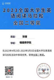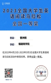在为期10天(4月23日8点—5月3日8点)的2023全国大学生英语阅读马拉松活动中,beat365官网学生积极参与,认真阅读答题,取得非常优异的成绩。其中,2020级商务英语专业曾洲桐同学获全国一等奖且排名第一,同样来自2020级商务英语专业的张婕和张雅龙同学获全国二等奖,来自2022级商务英语专业的程俊炜同学获全国三等奖。