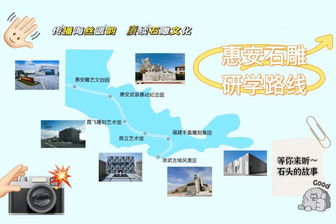 随后,实践队设计出了一条集知识性、趣味性、体验性于一体的惠安石雕研学路线,并手绘地图、拍摄英文宣传片,得到当地诸多好评。这条研学路线不仅展示了惠安石雕的艺术魅力,还通过互动体验吸引更多年轻人了解、体验和传承这一国家级非物质文化遗产,为海丝非遗文化注入新的活力。