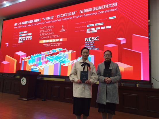 12月31日,第24届中国日报社“21世纪.可口可乐杯”全国英语演讲比赛福建赛区决赛在福建农林大学落下帷幕。经过激烈比拼,beat365官网外语系17商务英语1班黄琳同学荣获二等奖(指导老师:谢玉容)、17商务英语3班朱吴钰同学荣获三等奖(指导教师:姚剑平)。