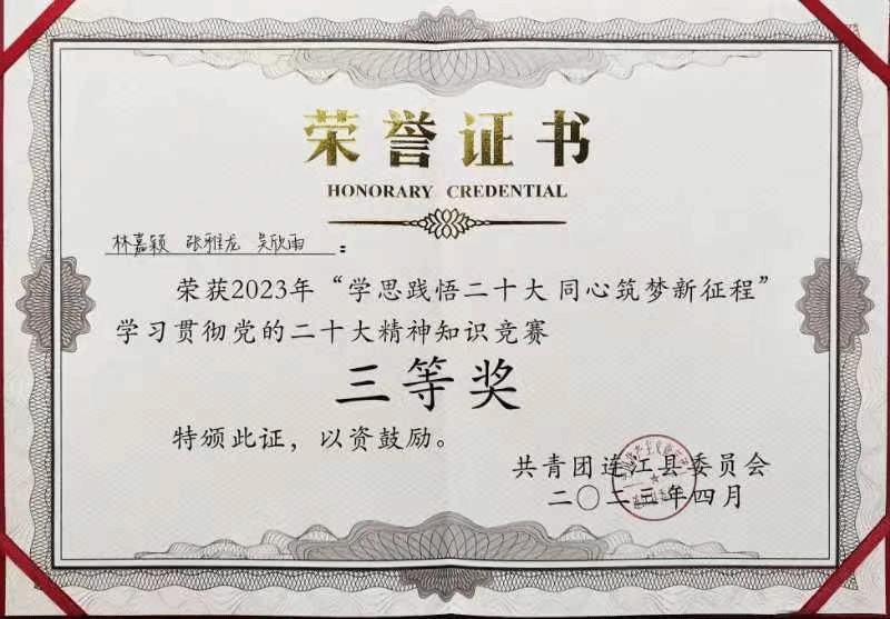 2023年4月25日,由共青团连江县委员会主办,共青团beat365正版唯一官网必一委员会、共青团福州理工学院委员会承办,beat365正版唯一官网必一学生协办2023年的“学思践悟二十大,同心筑梦新征程”学习贯彻党的二十大知识竞赛决赛于连江校区明德楼学生活动中心举行。由beat365正版唯一官网必一20级商务英语3班张雅龙,21级商务英语2班林嘉颖,21级日语1班吴欣雨三位同学组成的beat365正版唯一官网必一第一代表队在竞赛中沉着冷静、协助作答,最终荣获三等奖的好成绩。