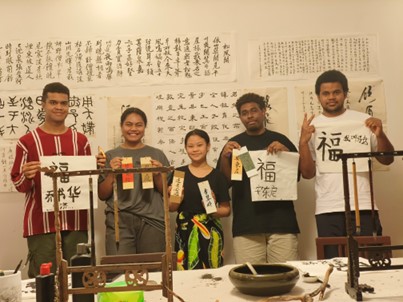 本次活动共设“红色经典共读”“中外学子共书‘福文化’”等环节。读书社的成员们通过深度学习,不仅了解了“福”文化的历史渊源、文化内涵及现代价值,同时通过体验书法感受了中华优秀传统文化的魅力,展示了自己的作品并分享制作过程的心得体会。活动过程中还设置了“福”文化知识竞答环节,使活动现场增加了不少趣味性。来自基里巴斯的留学生Susana说:“十分高兴能参加这次主题活动,在听经典诵读和学习毛笔书写的过程中也明白了什么是‘福气’,什么是‘幸福生活’,更加喜欢我们的‘福商’。”