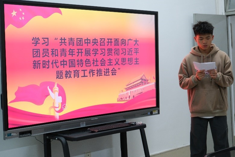 青年代表陈锦义同学以自身情况为切入点进行分享,他表示此次主题教育会议推进了团员和青年对四个专题的学习,加深了他对习近平总书记关于青年工作重要思想的理解,明确了思想旗帜,同时作为新时代青年应坚强核心,勇担责任,发挥团员、青年的模范带头作用,提高服务意识。郭文静同学通过学习会议内容发表感悟,她认为广大青年要加强理论知识的学习,提升自身素养,坚持理论联系实际,学以致用,并形成自己的思维方式和思想体系,与时俱进地分析新情况、解决新问题、打开新局面。在场的同学们一致表示作为后继者,当勤勉以赴,挺膺担当,共筑强国复兴路。
