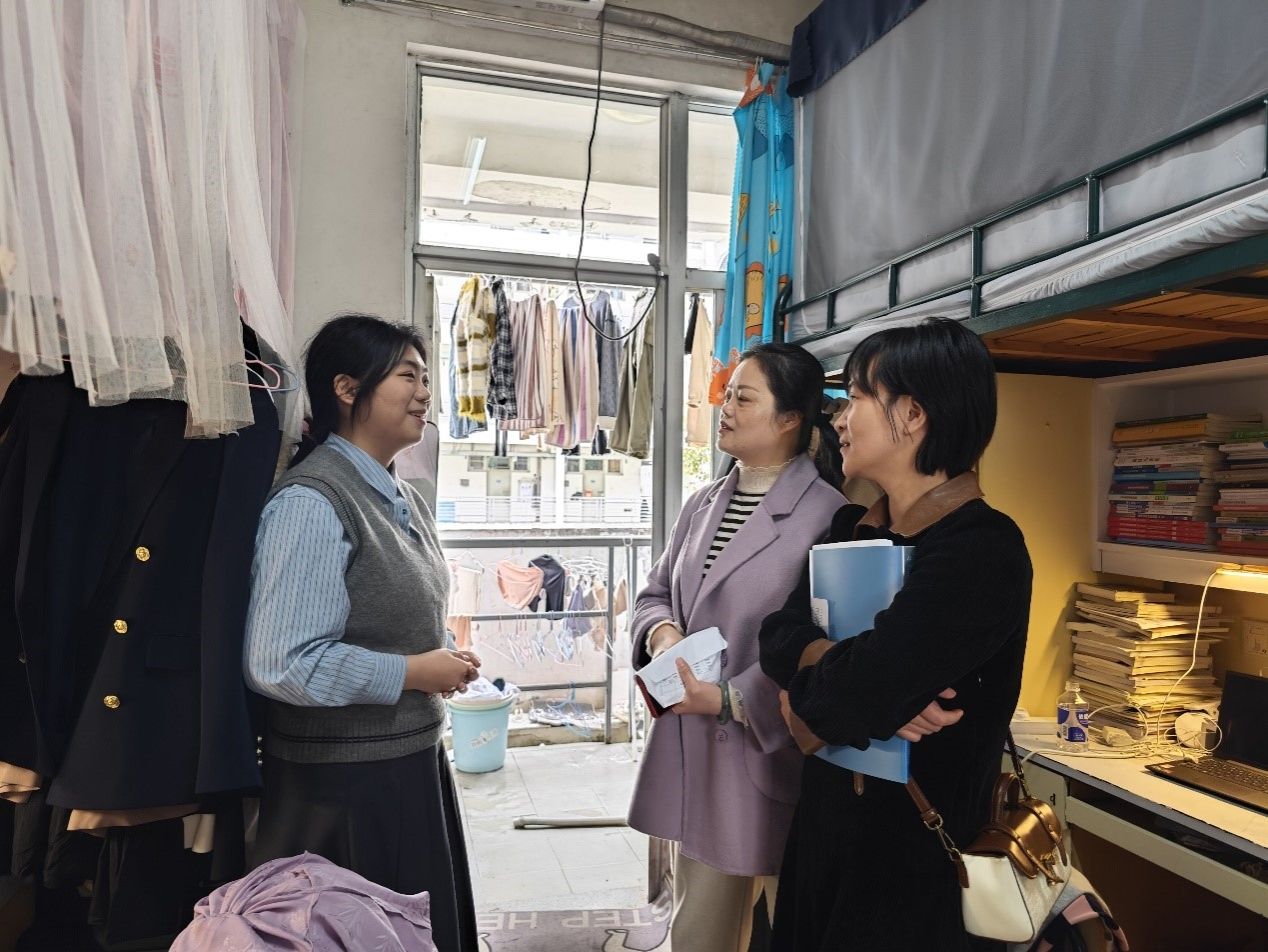 2024年3月27日,beat365官网党委副书记杨爱娥带领辅导员、自律会学生干部走进学生宿舍,进行实地走访调研,深入了解同学们的生活环境和学习状态,给同学们送去关怀和问候。