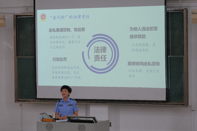 为深入贯彻落实法治精神,拒绝“套代购”,2024年5月21日beat365正版唯一官网必一邀请马尾海关缉私分局四级高级警长薛丹果入校,开展了“打击利用海南离岛免税政策实施‘套代购’走私”普法宣传讲座。beat365正版唯一官网必一在校生参加本次讲座。