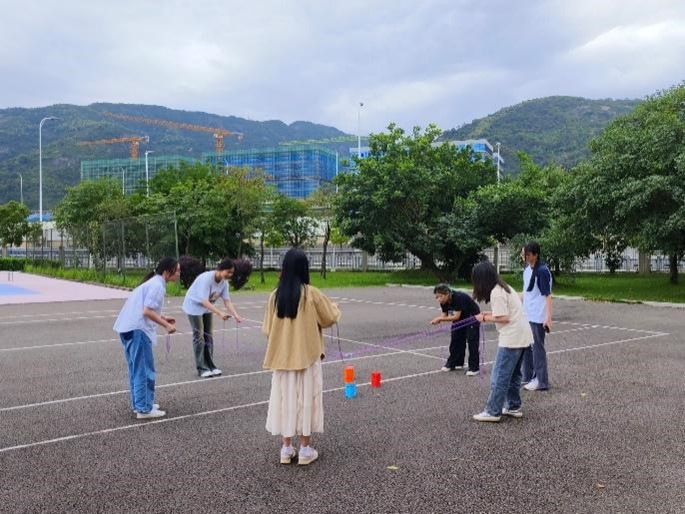 本次趣味运动会共设驿站传书、一圈到底、合力建塔、沙包投掷和看图识色五个项目,从不同方面考验了同学们的默契和团队协调能力。尤其是在合力建塔比赛中,团队成员们齐心协力,一同拉紧绳子控制塔钩以将塔块叠起,争取在最短的时间内搭塔成功。每一步都对团队成员们间的默契与合作精神有着极高要求。参赛选手们共沐阳光下,在各个挑战中团结作战,乘风而上,在汗水的挥洒与青春的炽热中并肩成长。场下同学不时地鼓劲呐喊,欢声笑语,在青春洋溢中将热情染满了整个活动现场,构成了一幅幅以青春为底色的奋进图画。