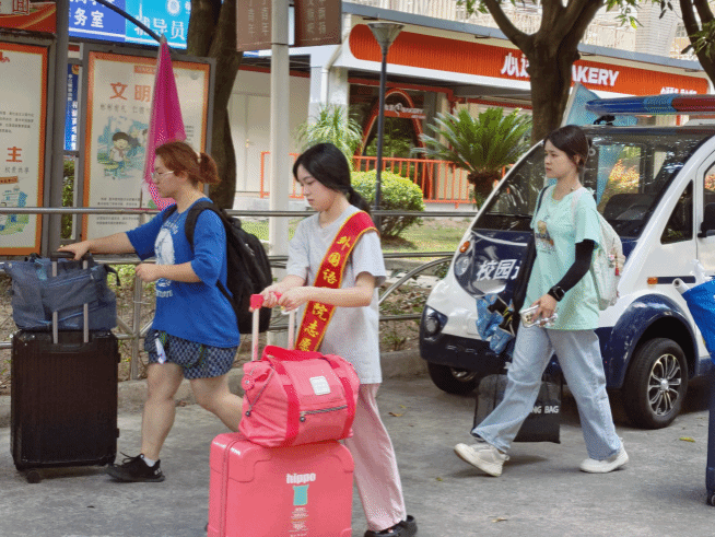校党委书记吴访益、校长程灵、纪委书记林宇峰莅临现场,亲切问候迎新现场的师生,并对前来报到的家长和新生表达了诚挚的欢迎。身披红色绶带和马甲的志愿者们分布在各个迎新站点,他们顶着烈日帮助新生搬运行李、提供校园导览、介绍校园布局,井然有序地带领新生前往外语体验中心办理入学手续,以饱满的热情迎接五湖四海的外语人,以实际行动诠释“以心换新”的迎新理念。