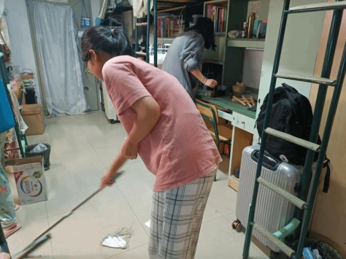 宿舍成员们各尽其职,积极行动,打扫时认真仔细,不放过任何一个角落。他们先规划后整理、先整理后收纳、定好收纳位置、把握好空间容量,原本摆放杂乱的书本得到了整齐有序的安置,横七竖八的杂物都有了自己的归所,杂乱无章的桌面焕发新的气息。洗手池、卫生间及墙角等卫生死角区域无一遗漏,成员们合理分工,互相配合,将清洁过程中的困难一一克服,提高效率的同时也提升了舍友间的感情,干净整洁的宿舍环境为同学们营造了良好的学习氛围。