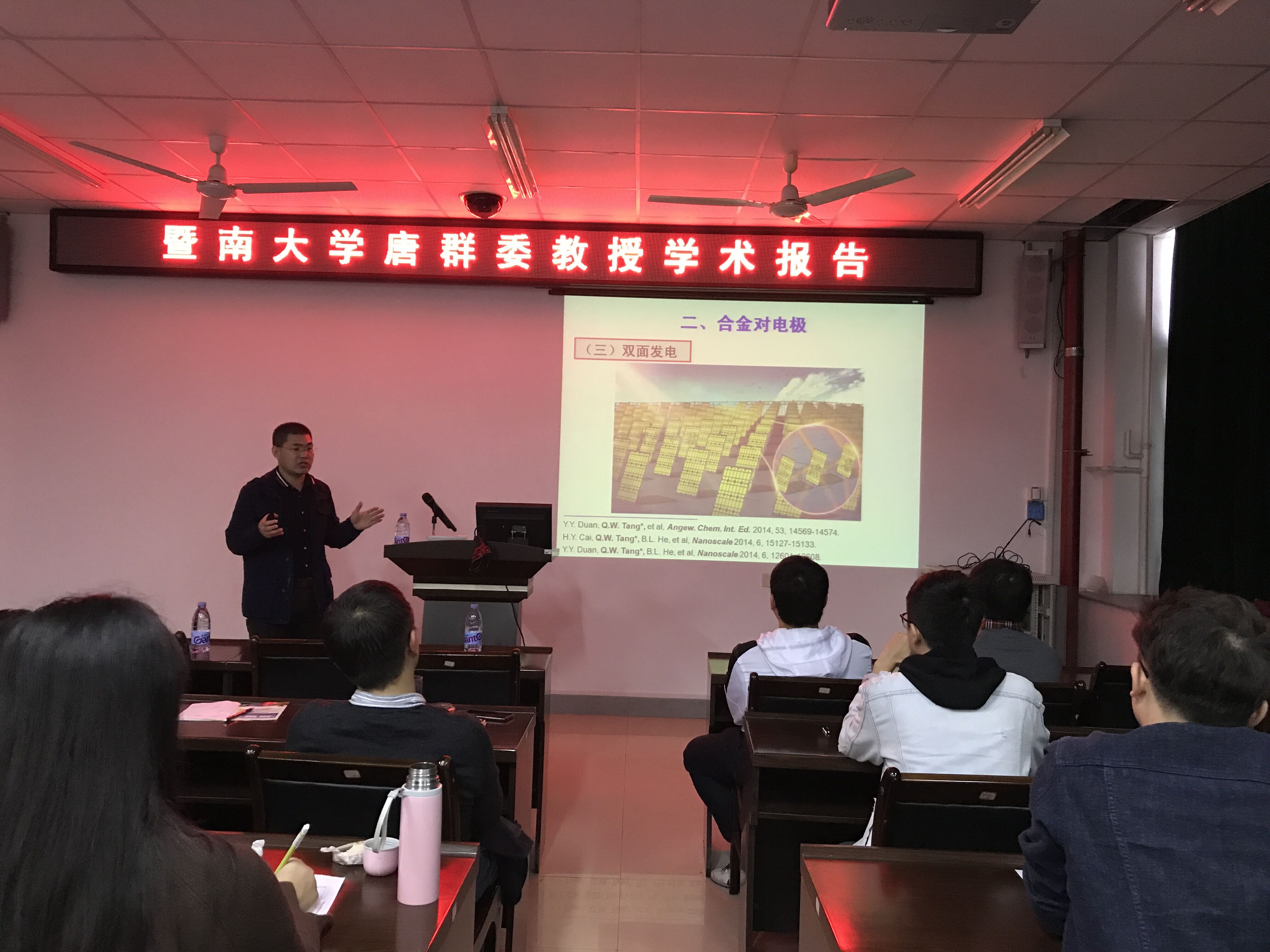 报告上,唐教授介绍了现有染料敏化太阳能电池(DSC)的研究进展和存在的问题,比较了由固态染料敏化太阳能电池发展而来的钙钛矿太阳能电池(PSC)在电池效率和制作工艺方面的优势,但存在长期稳定性方面的问题。经过研究,该课题组提出多步液相技术制备高纯CsPbBr3薄膜,并通过石墨烯量子点的界面能级优化,促进电荷提取过程,进而提高电池的光电转换效率。报告尾声,唐教授与必赢76net官网师生就相关问题进行深入探讨和交流。