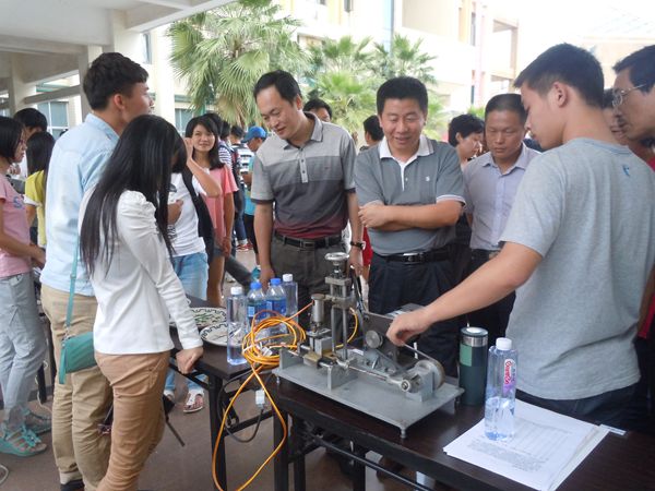 经过一个多月艰苦的竞赛实验期,在这关键的作品展示环节,选手们依次陈列出自己的参赛作品,并互相交流探讨,为往来的观众及评委老师热情解说小组的作品。在此期间,评委们选择较满意的作品并质询选手们,并为制作小组提出宝贵意见。来自研一的孙李珍队的参赛项目为“无机凝胶炭高效净水器滤芯的研制”,该作品含碳高,成本低,且可循环利用多达55次以上,其作品之优大为可观。邢昕队的“一款膜耐磨性能实用型试验机的设计与样机制作”为多数人围观,其样品的成型效果及实用性能得到评委们的一致好评。各队的参赛作品各异,其多数美观实用,观者对此惊叹不已。