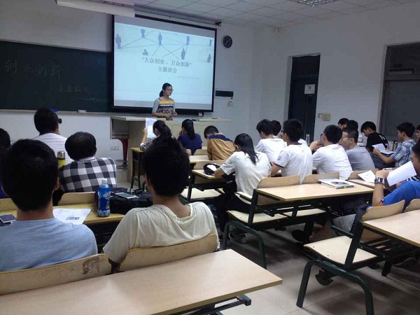 班会伊始,林青霞首先就自己亲身经历向同学们谈起小时候懵懂的创业梦想,并鼓励有创业理想的同学继续坚持,让同学们对创业有了更加感性的认识。随后同学们共同欣赏了第四届创新创业大赛宣传片,展示了众多青年创业者创业成功的案例,展现创新对创业的重要性。