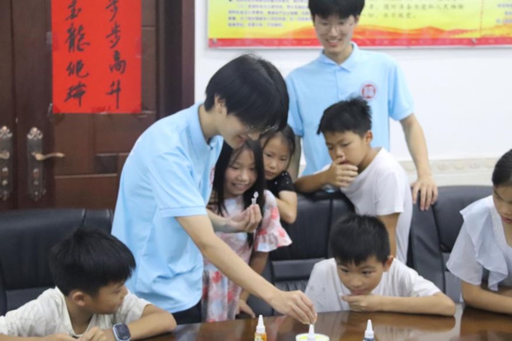 科普课堂上,实践队成员们首先通过“牛奶烟花”的实验点燃了小朋友们的兴趣,用日常可见的牛奶、洗洁精、颜料等物品,创造了一场绚丽的视觉盛宴。紧接着,实践队成员们引导孩子们亲手操作,帮助他们变身为小小的“色彩魔术师”。之后,实践队成员趁热打铁向孩子们分享了吸水性极强的吸水树脂材料的特性,让孩子们成为小小“科学家”,发散思维,探索吸水树脂材料在实际中的应用。