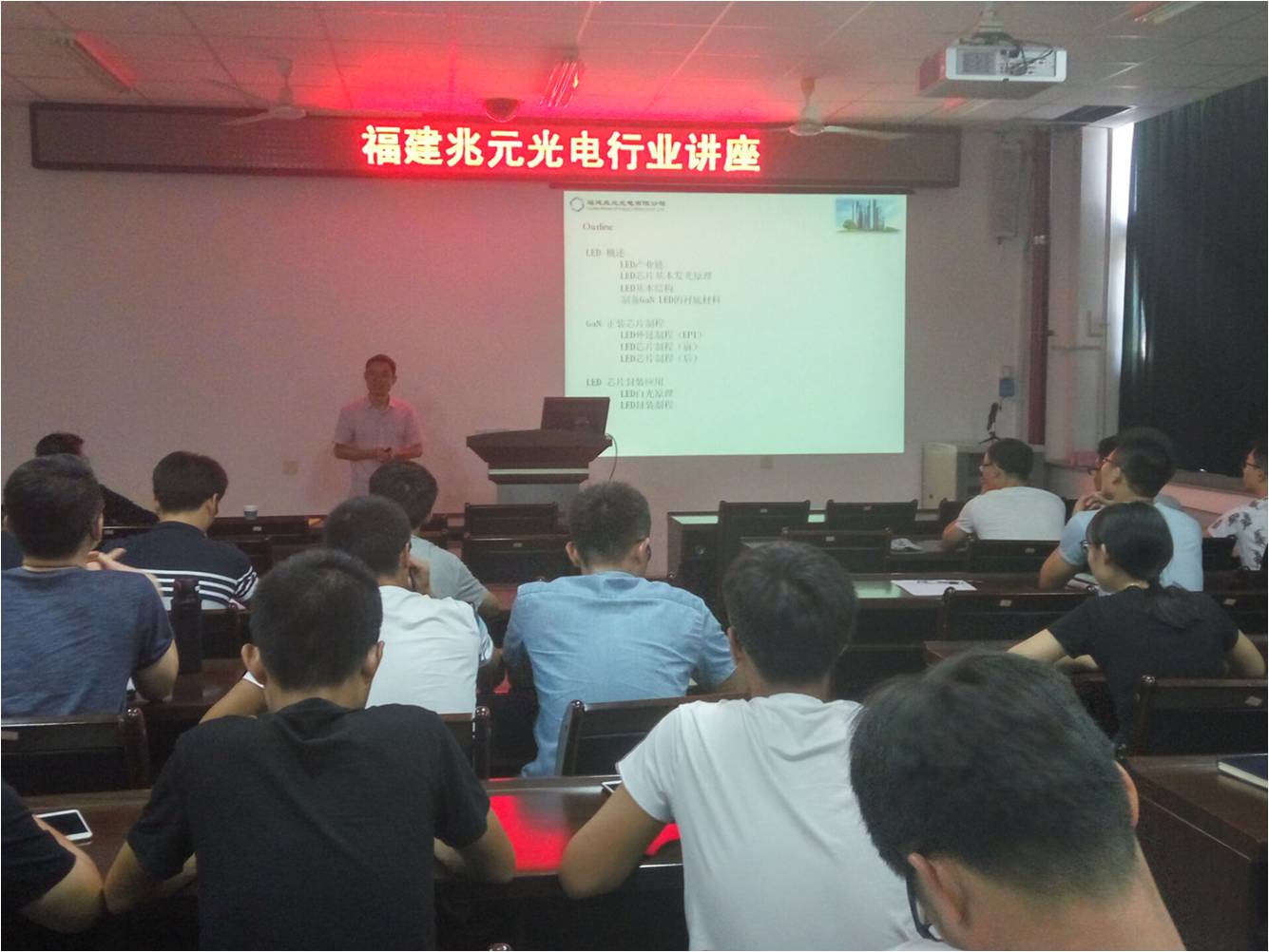 福建兆元光电有限公司的芯片处副处长赖余盟还为我们详细地介绍了LED产业链,LED芯片基本发光原理,LED的基本结构以及制备GaN LED的衬底材料的流程并提出相关特性要求和竞争力,之后赖处长还通过动画等为我们介绍GaN正装芯片的制程,包括LED外延制程、LED芯片制程。时不时还为我们讲解光学基本原理。最后赖处长还谈及了LED芯片封装应用等部分。同时在场的同学也提出了相关的问题,赖处长等企业负责人也为我们一一做了解答。