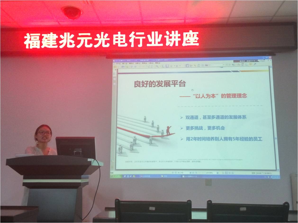 报告会上,福建兆元光电有限公司的人力资源部高淑琴经理为我们介绍了公司概况以及针对于毕业生即将开展的招聘会。福建兆元光电有限公司,位于福州市闽侯县南屿镇福州市生物医药和机电产业园,是由福建省电子信息集团与台湾鼎元公司合资设立,成立于2011年3月,主要从事高亮度发光二极管、LED外延片、LED芯片的制造、封装及应用产品的研发、生产。